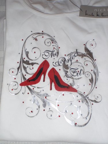 Nicole Miller Ladies White Shirt that has a pair of Red High Heels on the Front In Words are Written \" THE PERFECT FIT\" ......................................................... This can mean many different things to many people, who love shoes-Love another-Love Heels-Trying to tell someone you like them- Anniversary-etc.